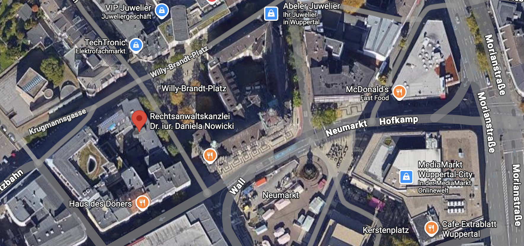 Meine Kanzleiräumlichkeiten sind sowohl vom Wuppertaler Hauptbahnhof, von der Schwebebahnhaltestelle Döppersberg, als auch von den Bushaltestellen Karlsplatz, Wall und Morianstraße fußläufig erreichbar.